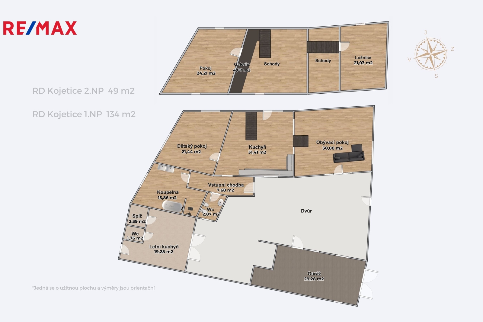 Dispozice obytné části (160 m²): předsíň, WC, koupelna, kuchyň, obývací pokoj, 2x dětský pokoj a ložnice. Dům se prodává částečně vybavený nábytkem na míru.