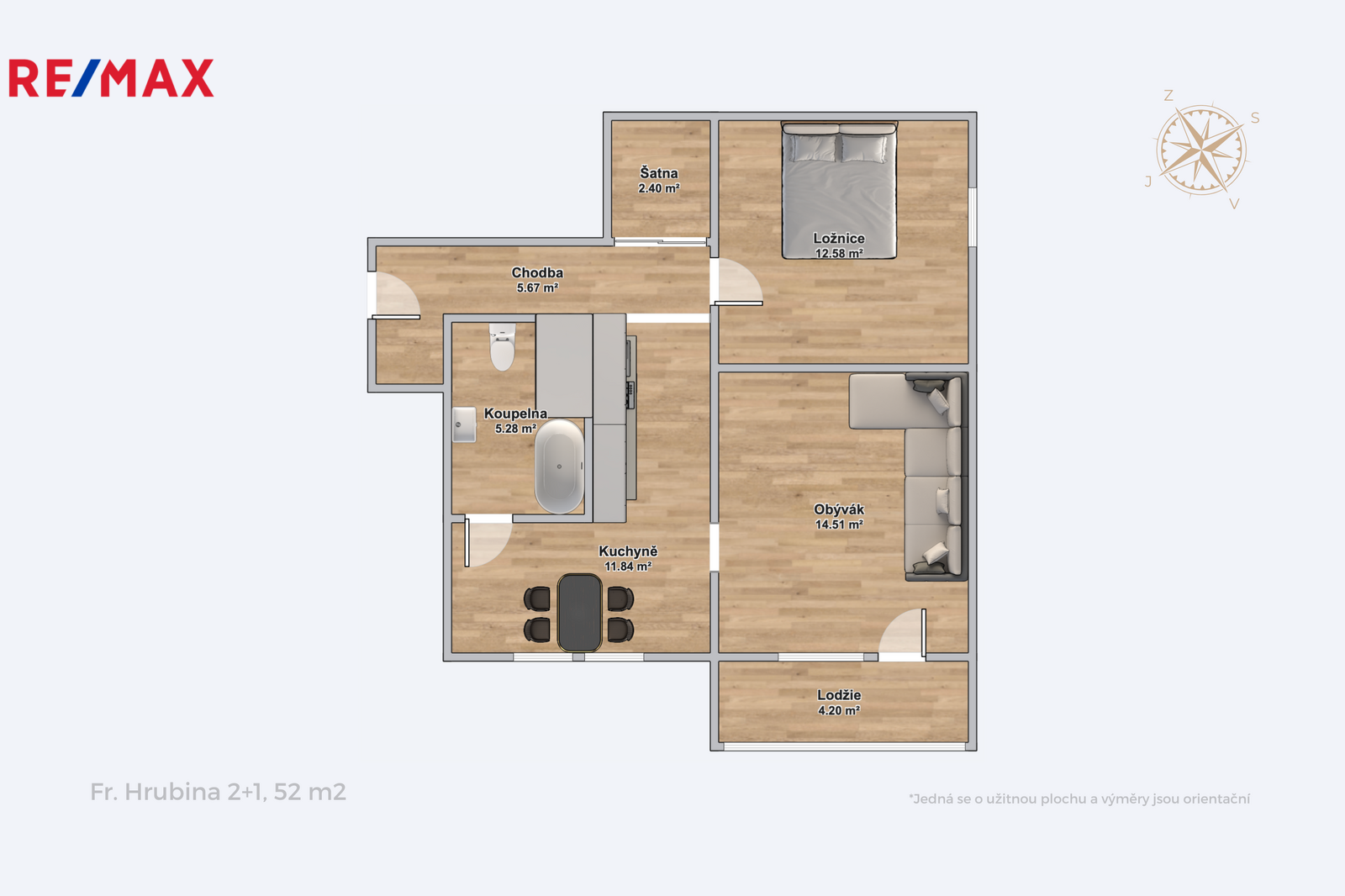 Byt je orientován na severovýchod, což zajišťuje dostatek denního světla bez nadměrného přehřívání v letních měsících.